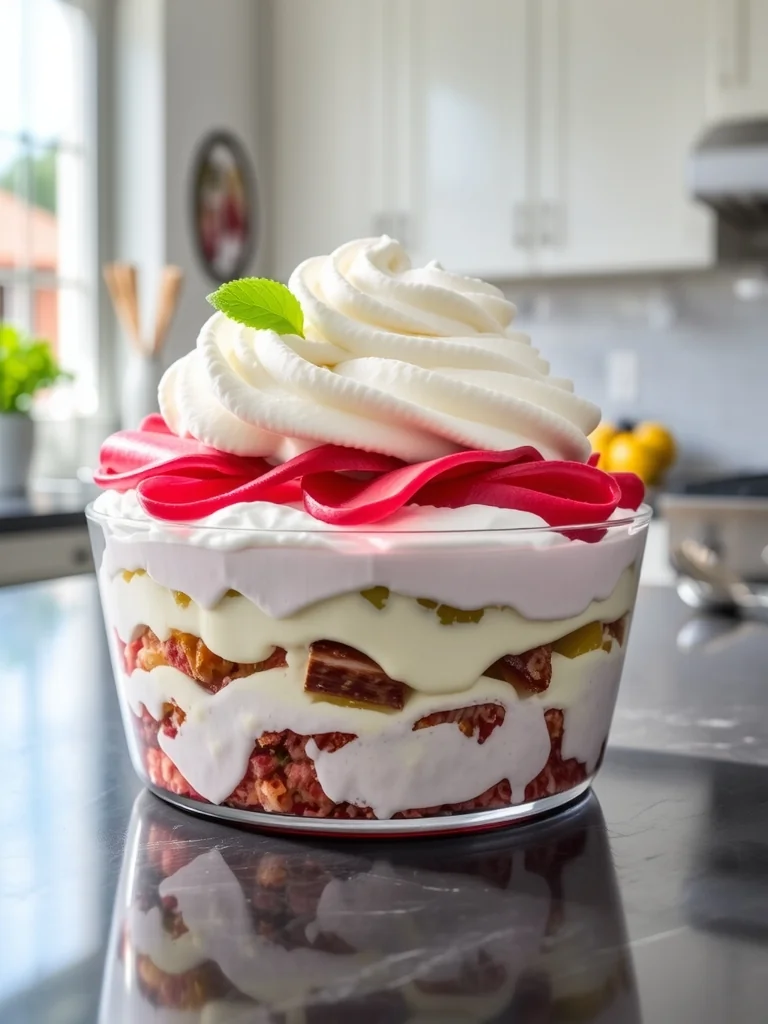 Whip cream to soft peaks, gently fold in macerated rhubarb for airy layers.