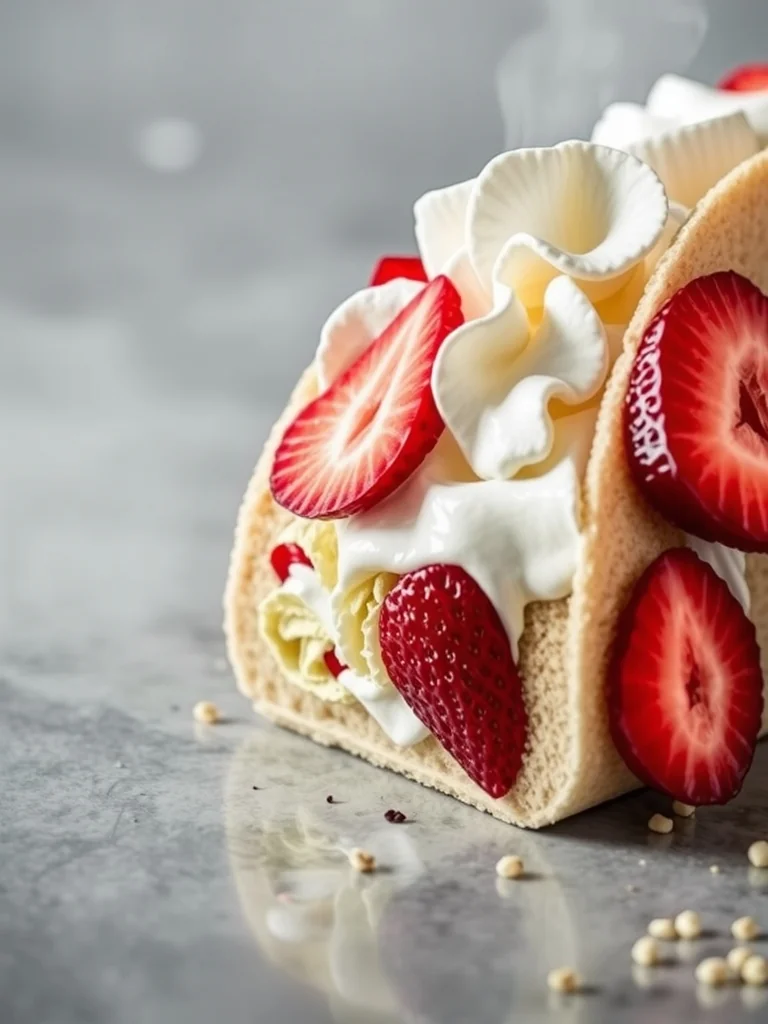 A playful twist on a classic dessert – soft, fluffy cake shells shaped like tacos, filled with sweet strawberries and airy cream. Perfect for summer gatherings or a quiet afternoon treat.